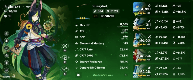 Enfin, la recharge d'énergie est un facteur important à prendre en compte. Tighnari est dépendant de son déchaînement élémentaire pour infliger des dégâts importants. Une recharge d'énergie suffisante lui permet d'utiliser son déchaînement plus fréquemment, augmentant ainsi son DPS (dégâts par seconde) global.